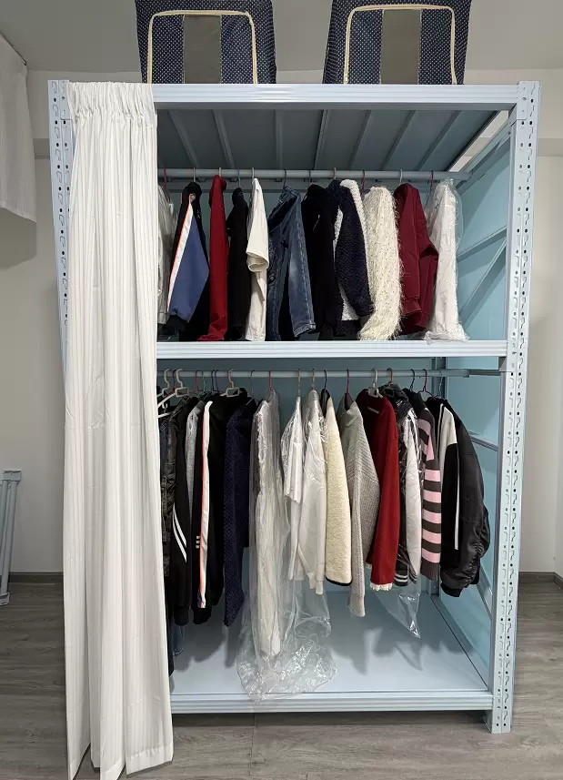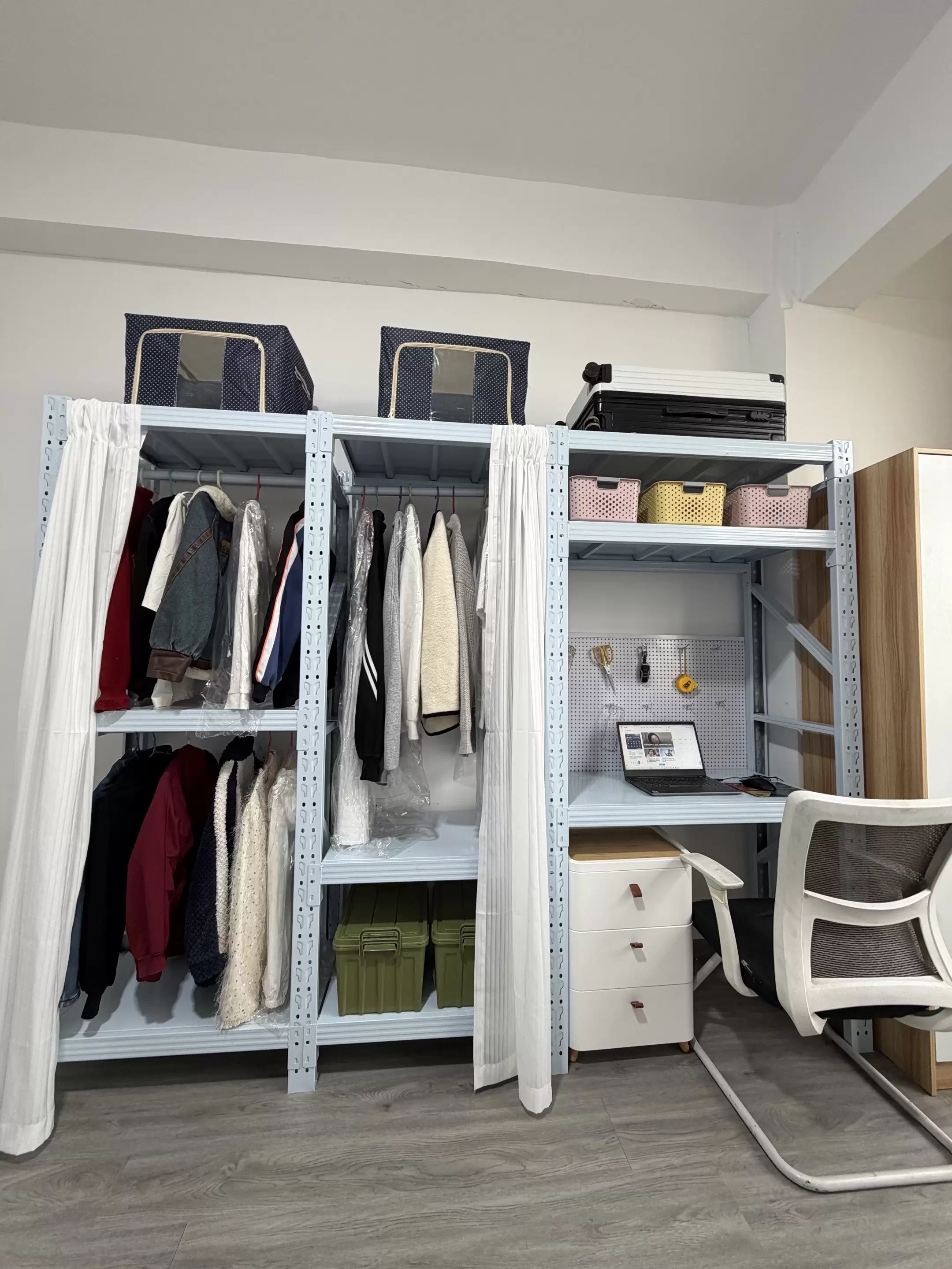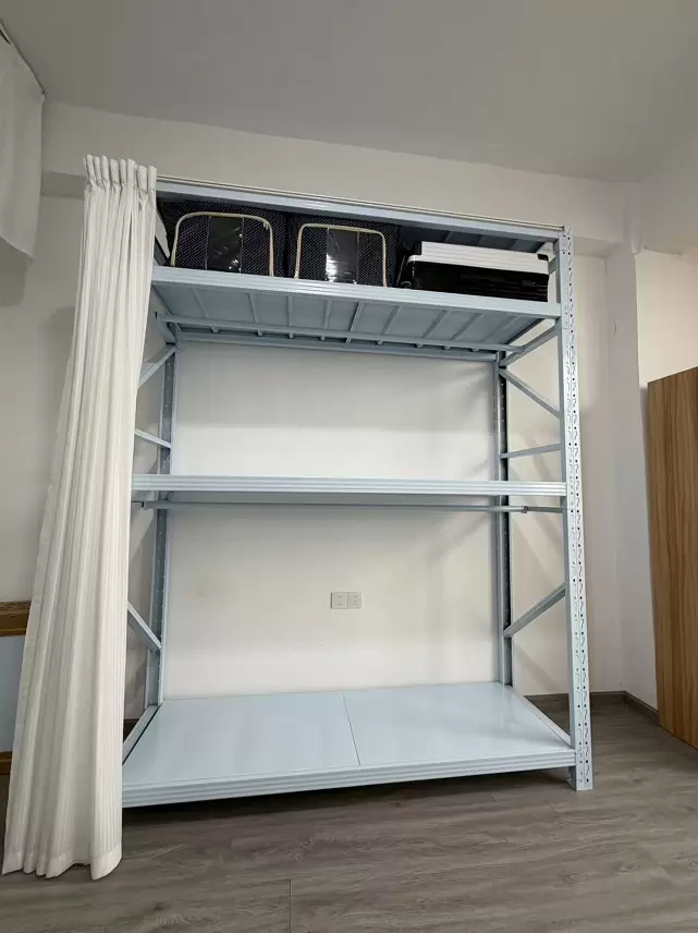 这款货架采用加厚冷轧钢材质打造,表面经过环保喷塑处理,不仅承重稳定、防锈耐用,更提供了可自由调节层高的立柱设计。用户可根据衣物悬挂高度、桌面使用需求、收纳箱尺寸,灵活调整层板间距,实现「一柜多用」的百变效果 —— 左侧设置全悬挂式衣物区,搭配定制挂衣杆实现衣物免叠放;中间层板改造为工作台面,搭配洞洞板打造办公收纳区;顶部与底部则可放置收纳箱、行李箱等大件物品,轻松实现「收纳 + 办公」双功能。搭配简约白色窗帘后,整体风格柔和清新,完美适配现代家居与工作室的装修氛围,彻底打破了工业货架的刻板印象。